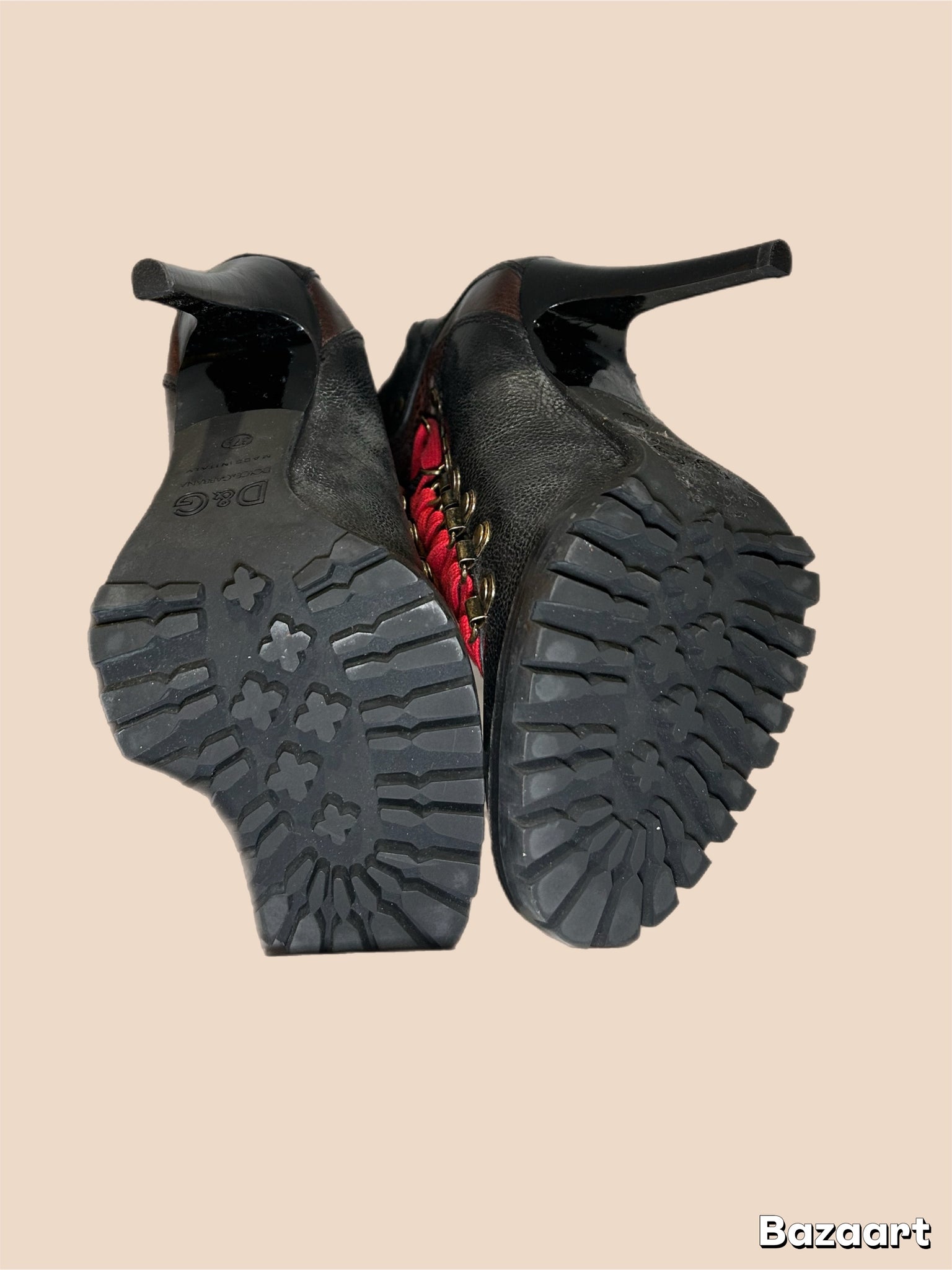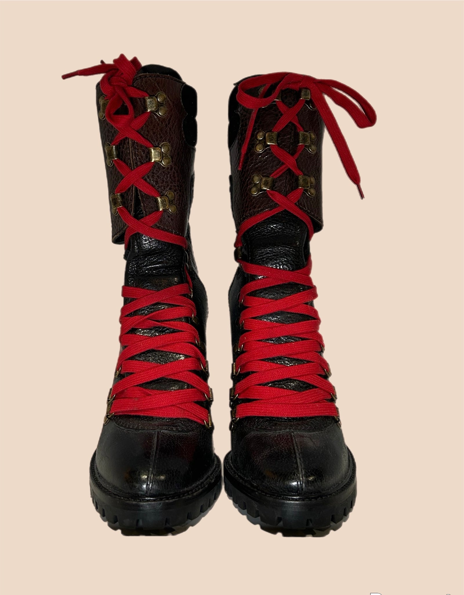 Glamourous to the max! These stunning punk-esque black and brown Dolce & Gabbana runway collection monster “ combat” boots are extremely well constructed, made from supple leather and feature contrast red laces.