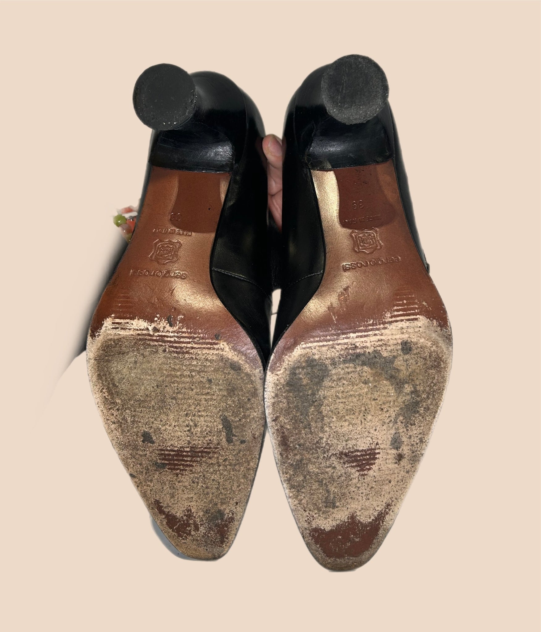 Classic pump reimaged as a mary jane with velcro closure. Silver hardware.