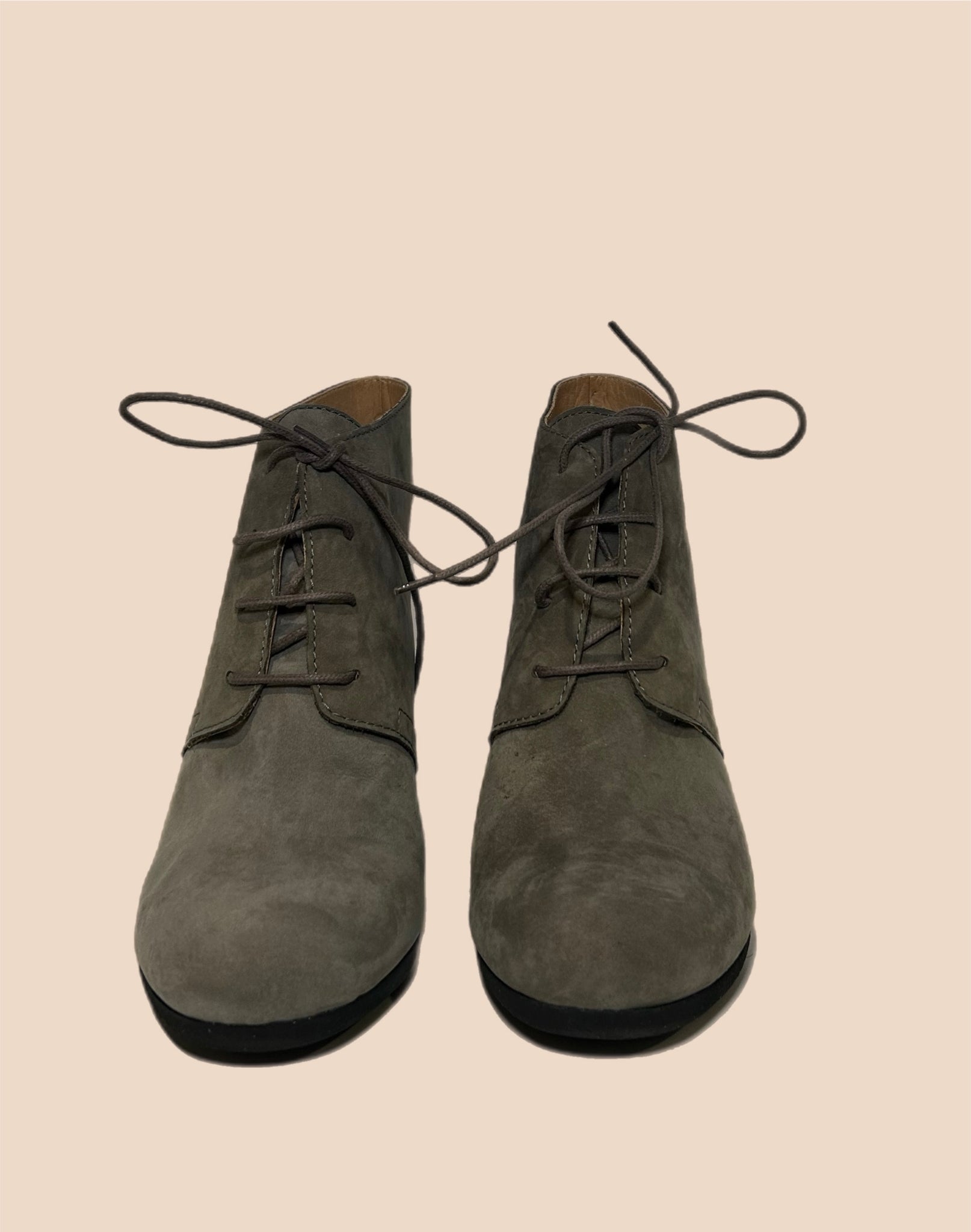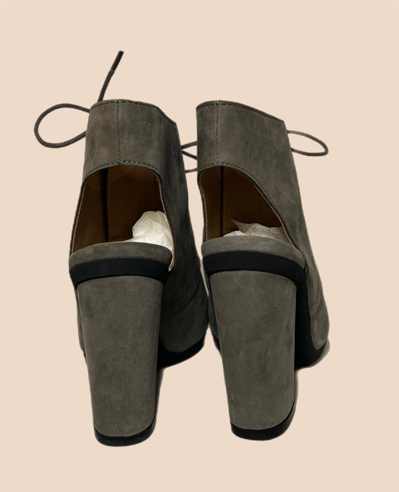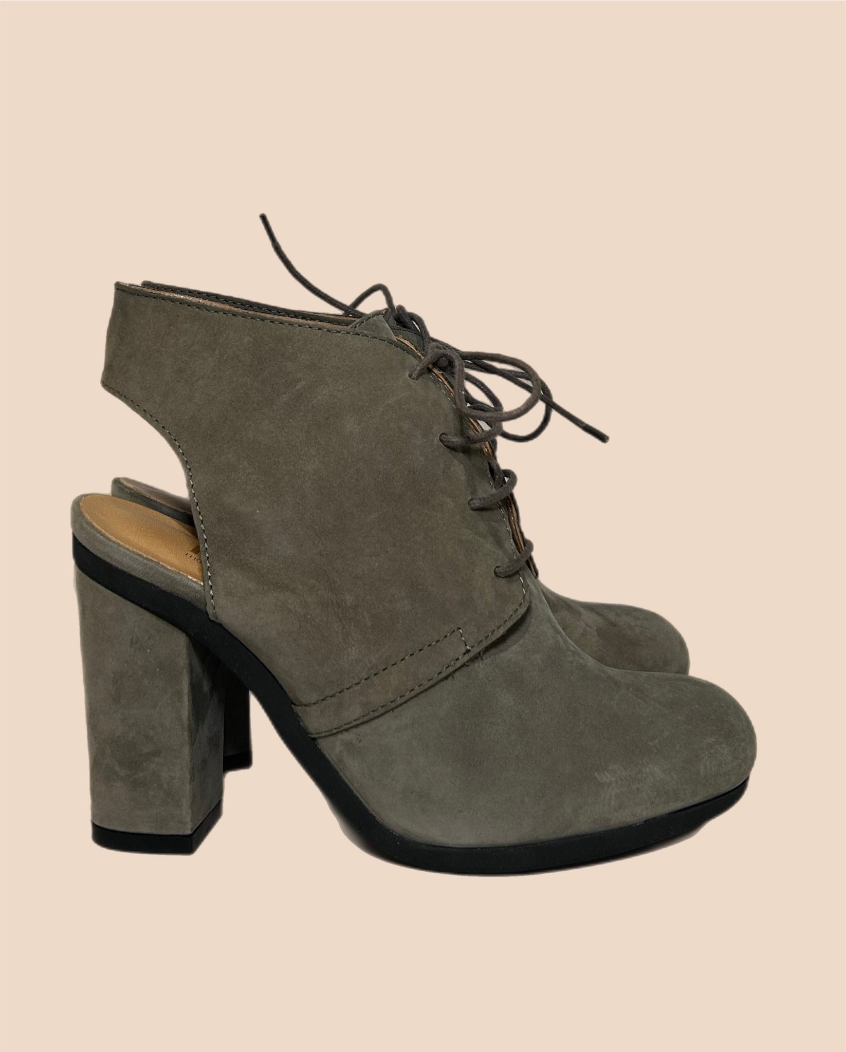 Cute and classic Margiela slingback bootie “ open back “ heels with a thick strap and laces. Beautiful suede construction with a muted gray colour.