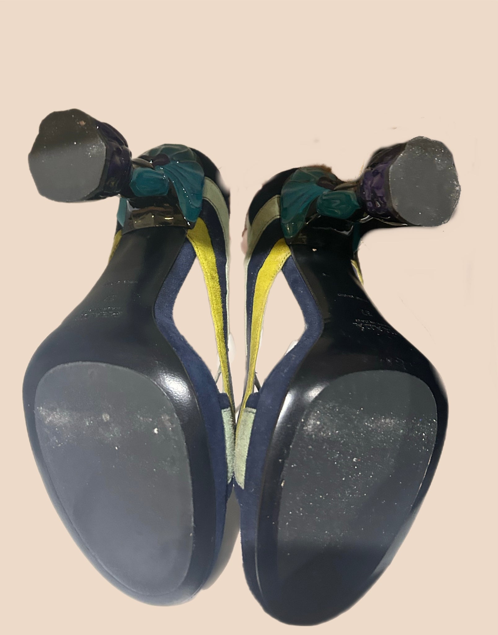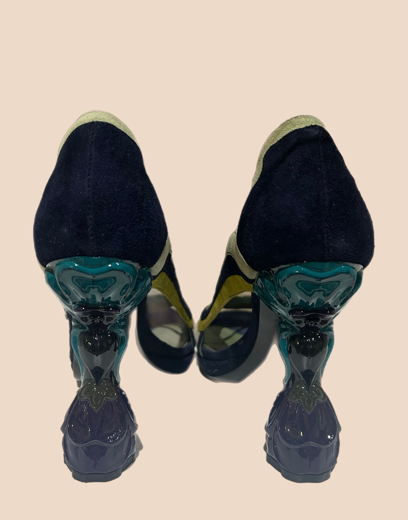 Featuring a Camoscio Wave strap these heels have a particularly unique design. The heel is sculpted with petals of varying colors like turquoise, black, forest green and indigo.